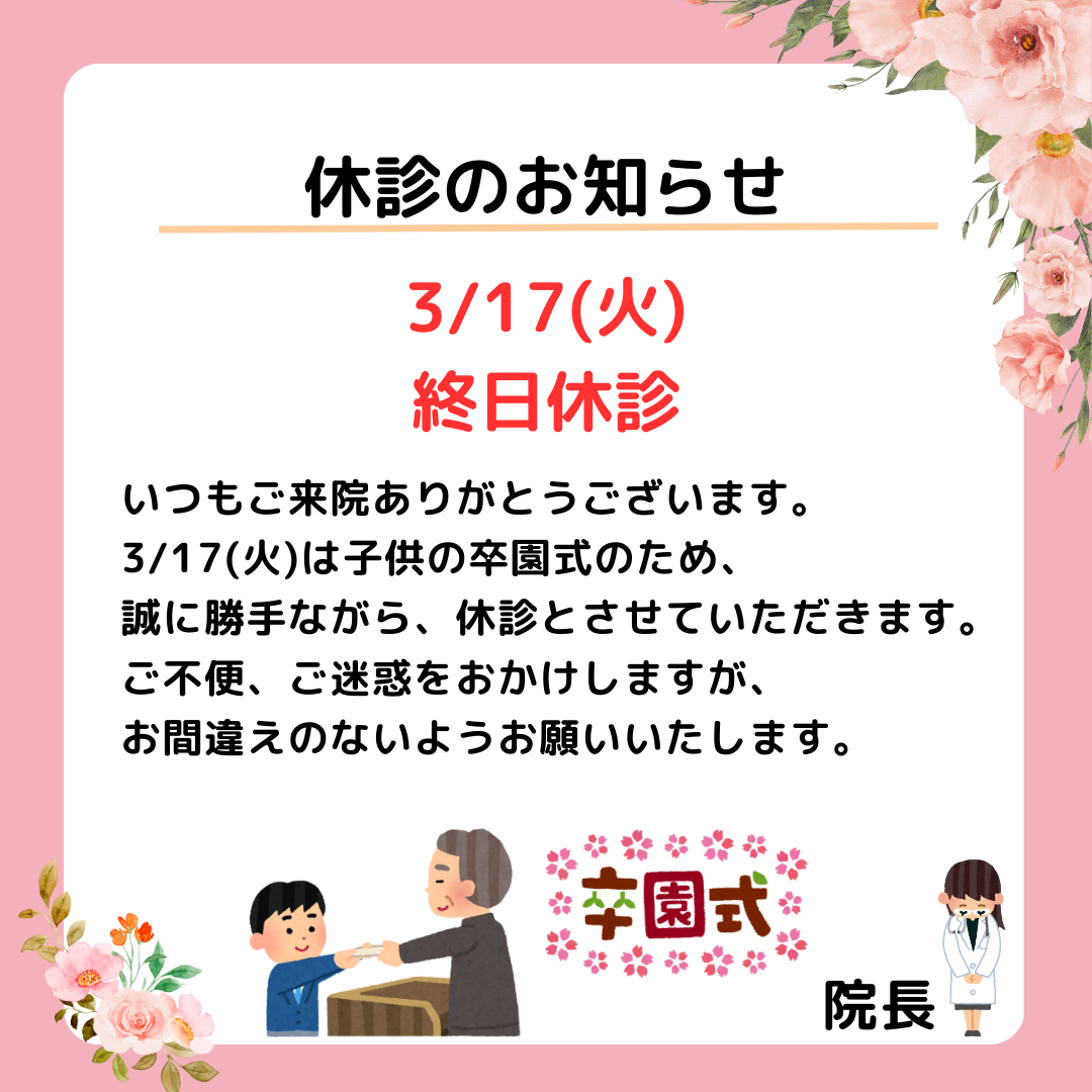 3月17日(火)は末っ子の卒園式出席のため、休診とさせていただきます。